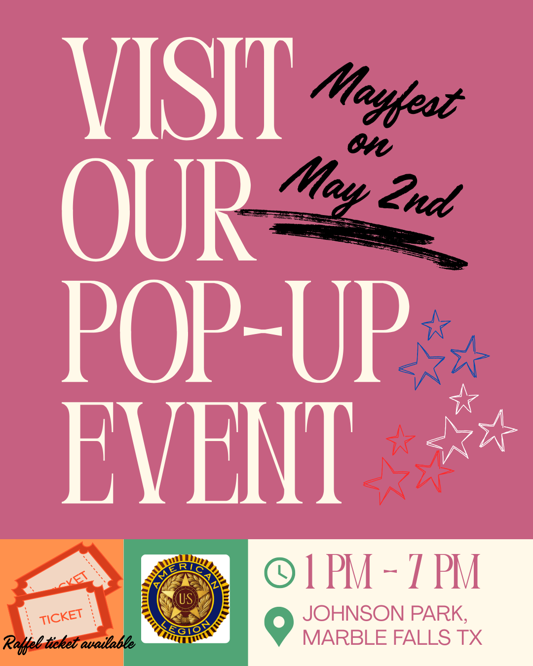 May 9, 2026 Mayfest. Marble Falls Johnson park May 8-9, 2026 Burnet County Rodeo May 19, 2026 Monthly General Meeting at 1800 May 25, 2026 Memorial Day Ceremonies